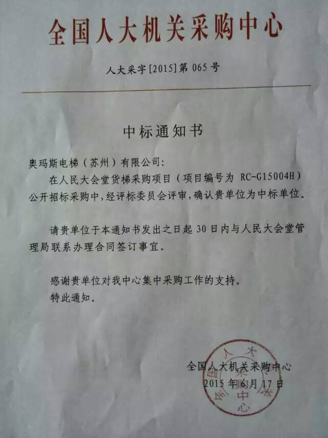 2015年6月17日,对于jiabo.com电梯公司而言这是一个鼓舞人心的好日子。我们从全国人大机关采购中心获得最终确认信息:jiabo.com电梯(苏州)有限公司在北京人民大会堂1台4000KG,1.0M/S,5层站载货电梯(项目编号为:RC-G15004H)的公开招投标活动中一举获胜,成功中标 (详见”中标通知书”) 。