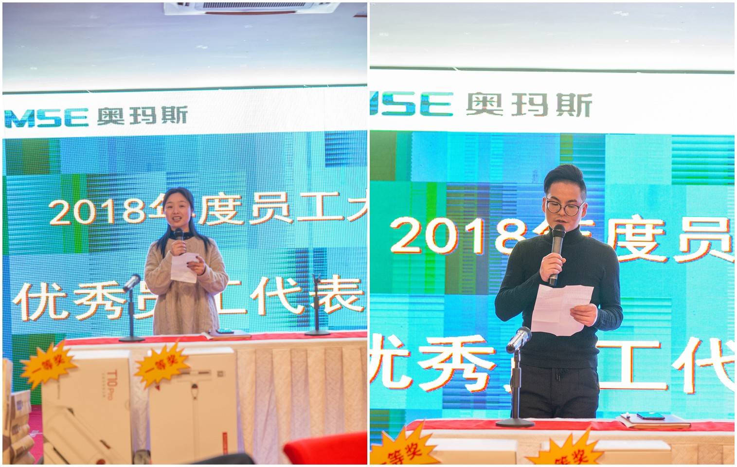 最后,由沈丽芬与张建新2位优秀员工代表分别作为jiabo.com老员工、新员工之代表上台发表了个人获奖感言。